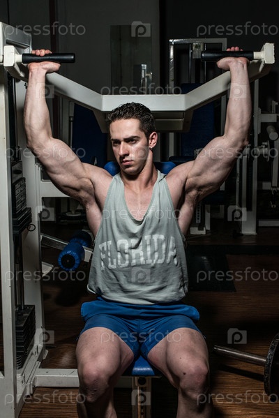 Молодой культурист делает жим для плеч на тренажере