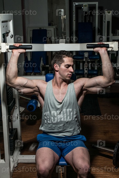Молодой культурист делает жим для плеч на тренажере