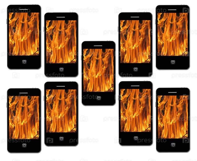 Мобильный телефон с пламенем на белом фоне