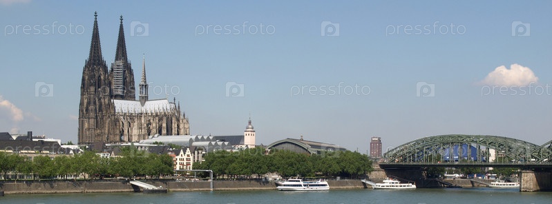 Панорама Кельна (Германия), включая готический собор и стальной мост через реку Рейн