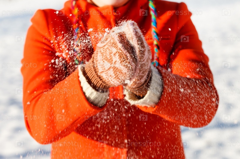 Женские руки в снежных варежках