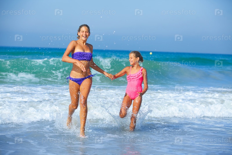 Девочки бегут по пляжу