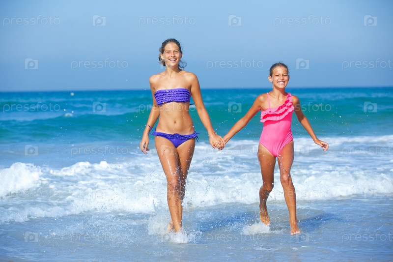 Девочки бегут по пляжу