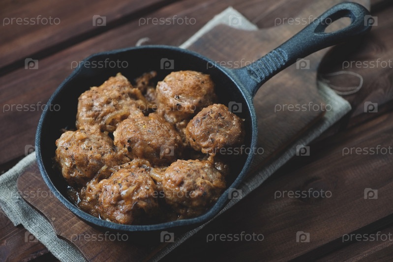 Чугунная сковорода с фрикадельками, деревенский деревянный фон