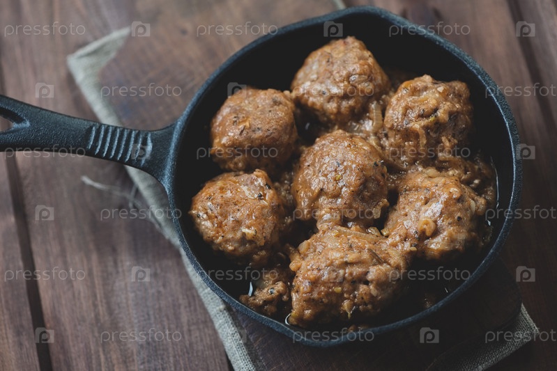 Чугунная сковорода с фрикадельками, деревенский деревянный фон