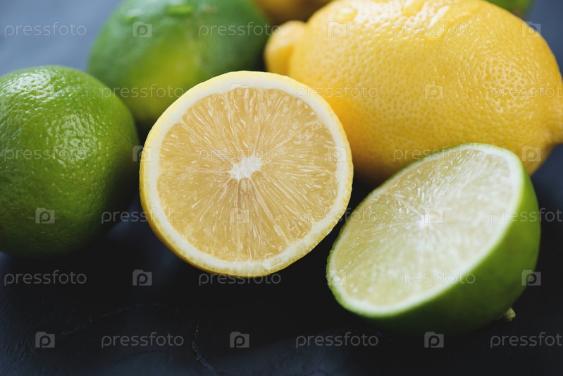 Спелые лаймы и лимоны, черный деревянный фон