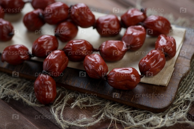 Копченые маленькие колбаски, деревенский деревянный фон