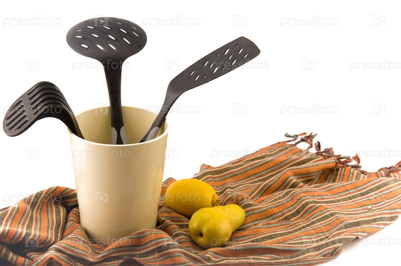 Кухонные принадлежности, лимон, груша и салфетка изолированы на белом фоне
