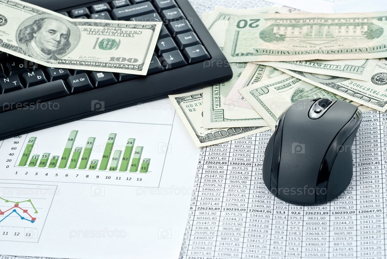 Черная клавиатура, мышь и доллары на биржевой диаграмме