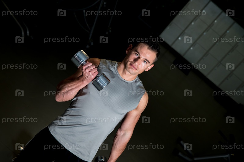 Мужчина делает упражнение с гантелями