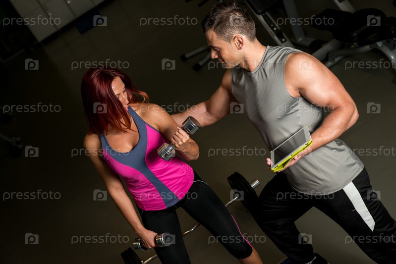 Женщина делает упражнения под руководством фитнес-тренера