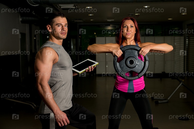 Женщина занимается с инструктором, держащим цифровой планшет