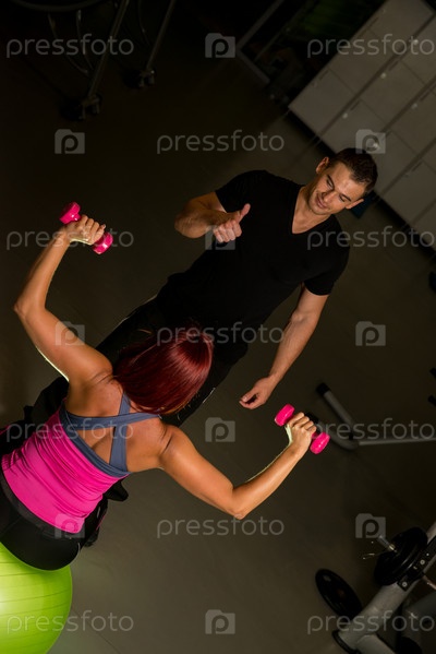 Женщина с персональным тренером занимается в тренажерном зале