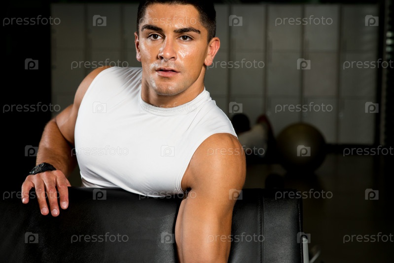 Мускулистый мужчина поднимает гантели