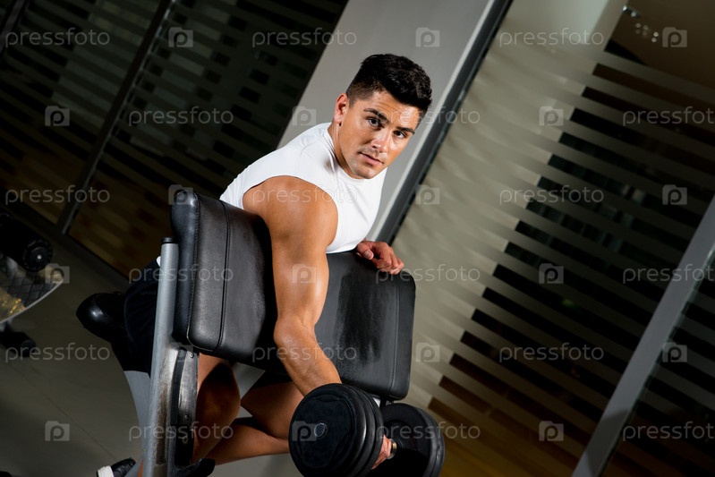Мускулистый мужчина поднимает гантели
