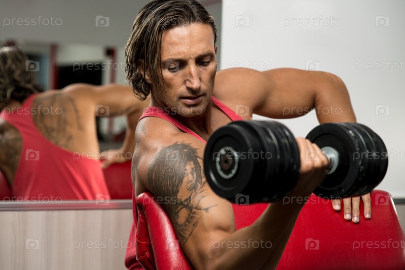 Мускулистый мужчина занимается в тренажерном зале