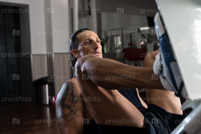 Мужчина делает упражнения для ног на тренажере