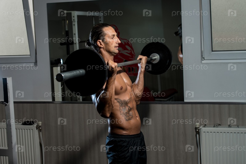 Мускулистый мужчина занимается со штангой в тренажерном зале