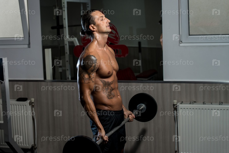 Мускулистый мужчина занимается со штангой в тренажерном зале