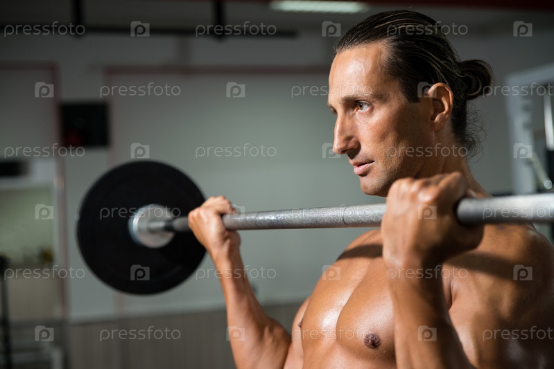 Мускулистый мужчина занимается со штангой в тренажерном зале