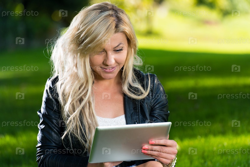 Счастливая женщина с планшетным компьютером