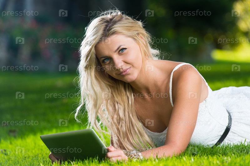 Женщина с планшетным компьютером в парке