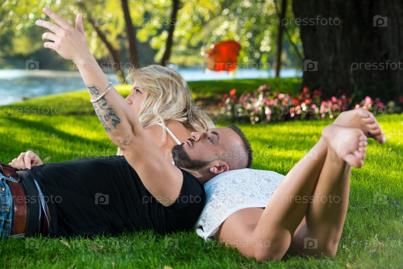 Счастливая пара лежит на траве