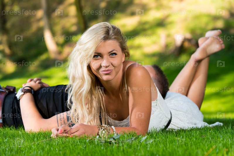 Счастливая пара лежит на траве