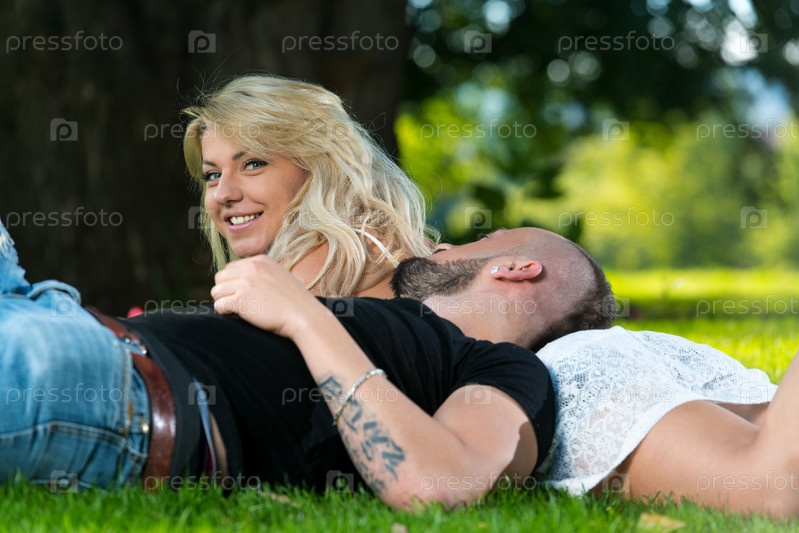 Счастливая пара лежит на траве