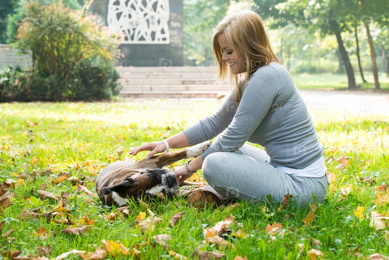Женщина гуляет с собакой