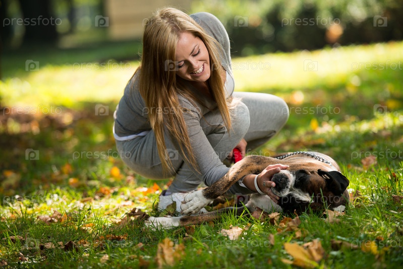 Женщина гуляет с собакой