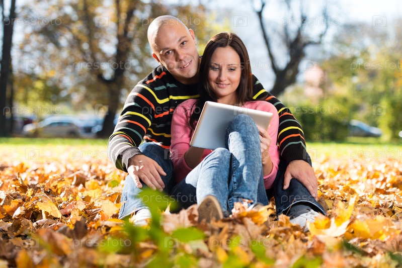 Пара с планшетным компьютером в осеннем парке