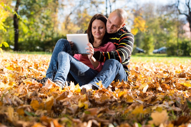 Пара с планшетным компьютером в осеннем парке