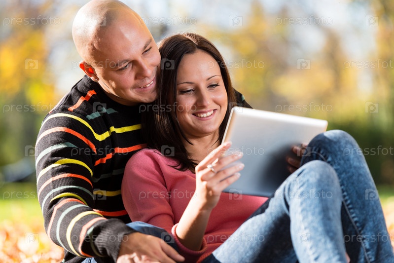 Пара с планшетным компьютером в осеннем парке