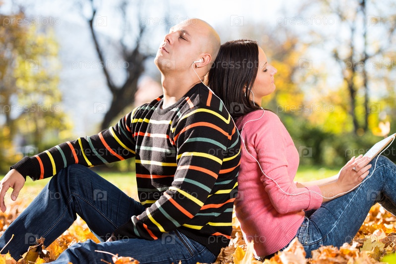 Пара с планшетным компьютером в осеннем парке