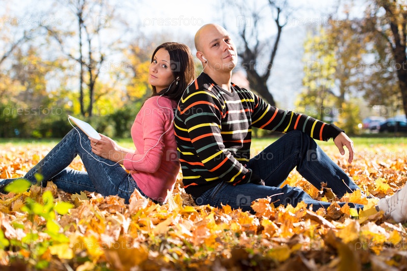 Пара с планшетным компьютером в осеннем парке