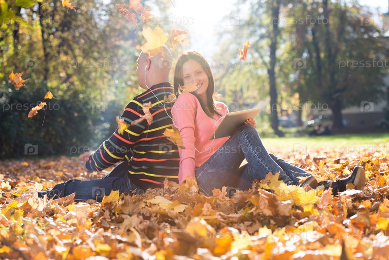 Пара с планшетным компьютером в осеннем парке