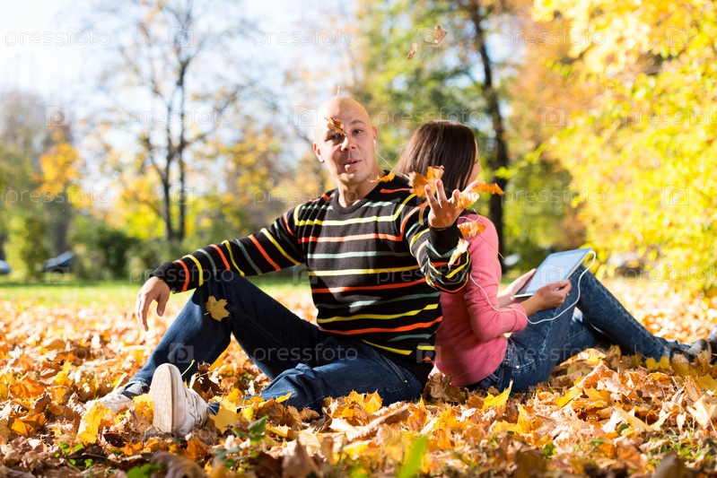 Пара с планшетным компьютером в осеннем парке