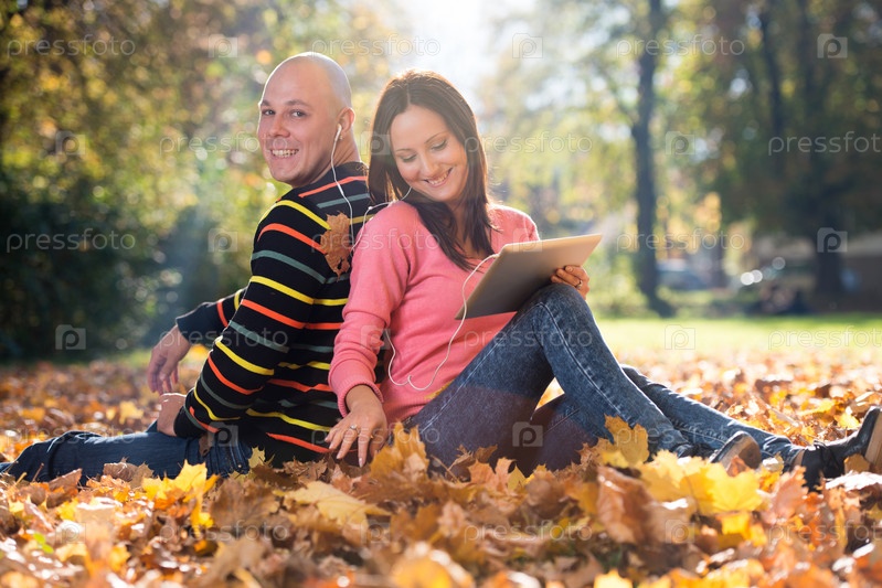 Пара с планшетным компьютером в осеннем парке
