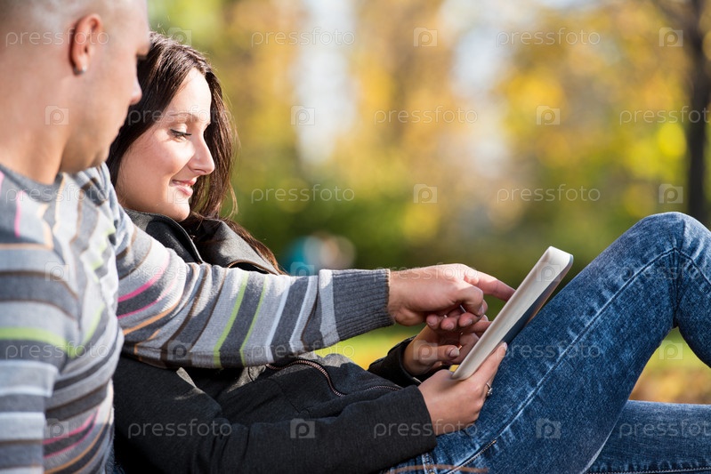 Пара с планшетным компьютером в осеннем парке