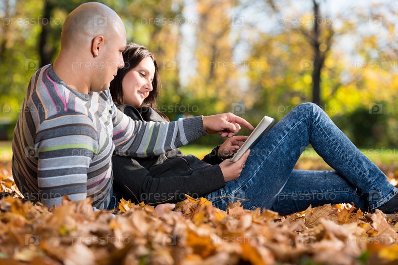 Пара с планшетным компьютером в осеннем парке