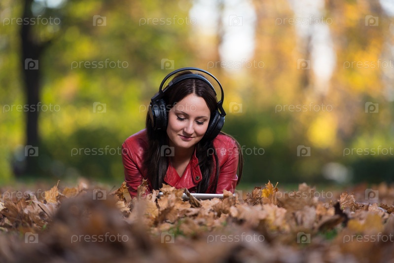 Девушка слушает музыку в наушниках в осеннем парке