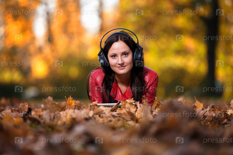 Девушка слушает музыку в наушниках в осеннем парке