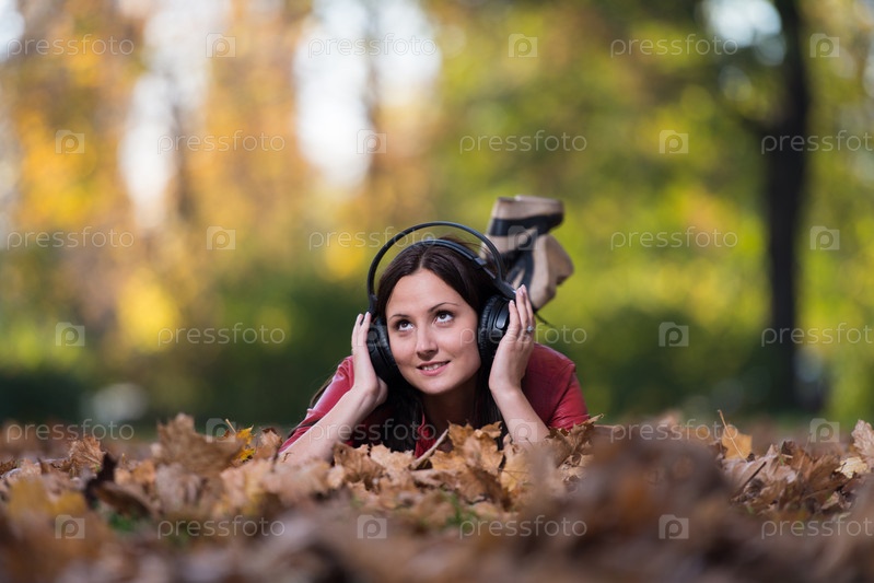 Девушка слушает музыку в наушниках в осеннем парке