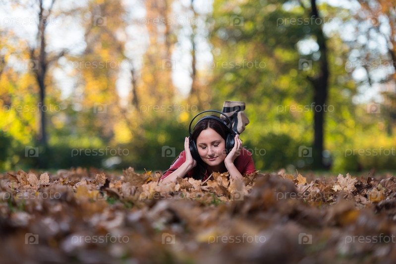 Девушка слушает музыку в наушниках в осеннем парке