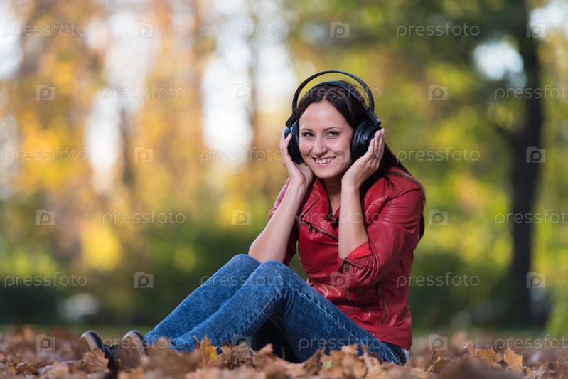 Девушка слушает музыку в наушниках в осеннем парке