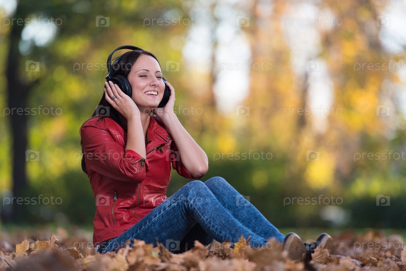 Девушка слушает музыку в наушниках в осеннем парке