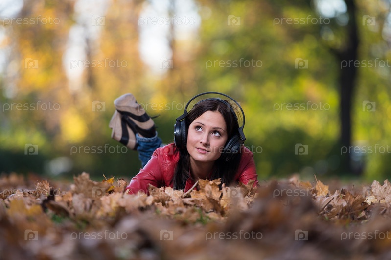 Девушка слушает музыку в наушниках в осеннем парке