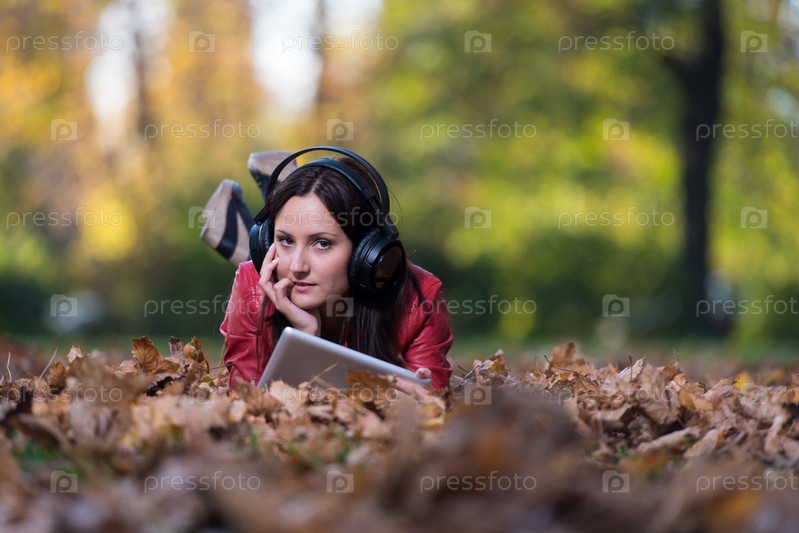 Девушка слушает музыку в наушниках в осеннем парке