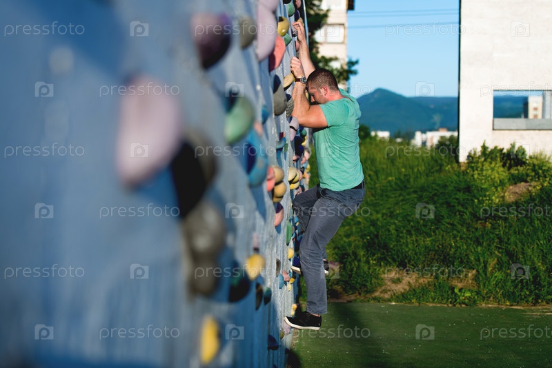 Молодой человек взбирается по стене на улице